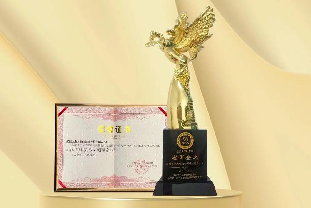 由中国新一代人工智能发展战略研究院指导,深圳市人工智能产业协会主办,广东未来产业研究院承办的2022年度“AI天马”认定结果揭晓,金大智能获评AI天马“领军企业”,金大智能董事长-王茂林先生荣膺“2022十大功勋人物”。